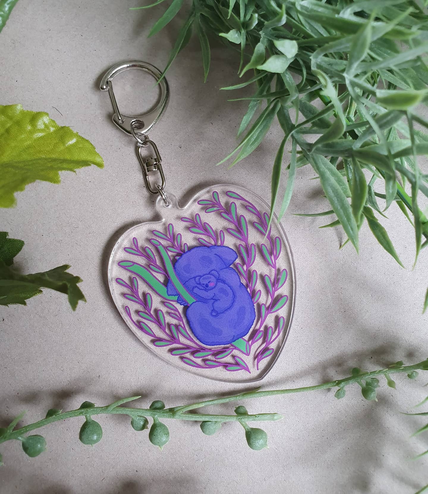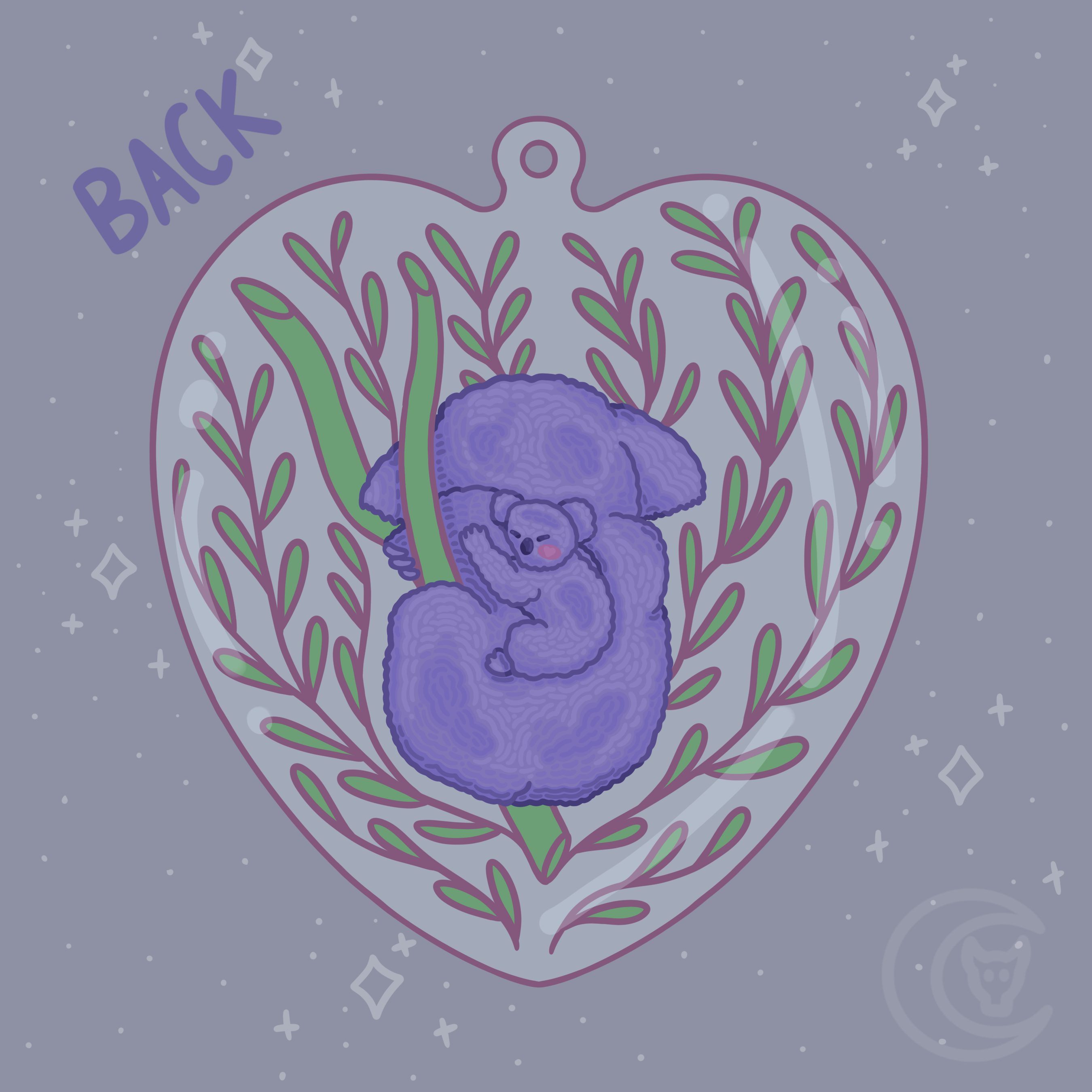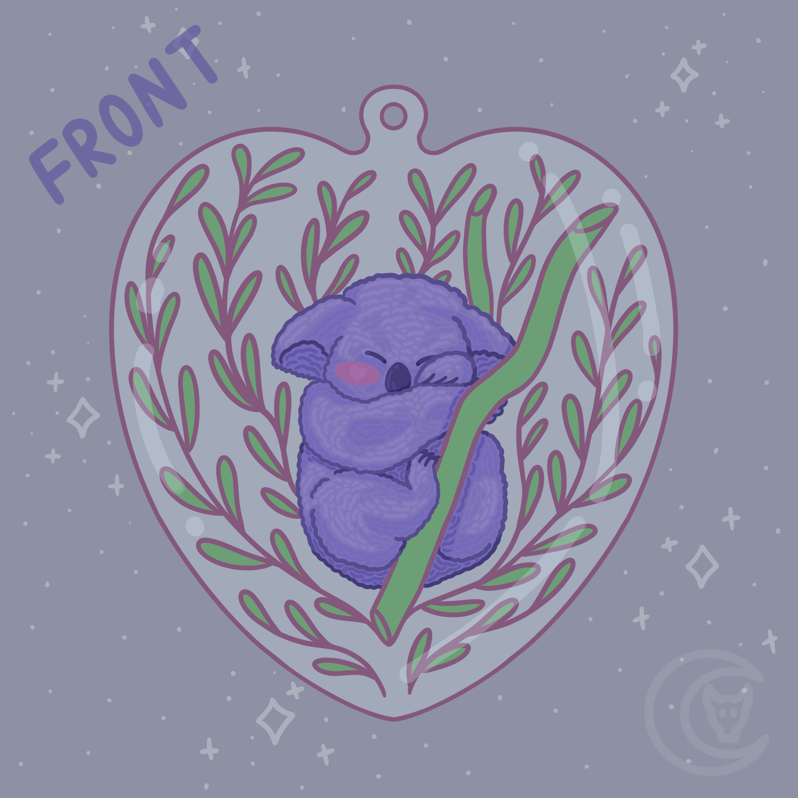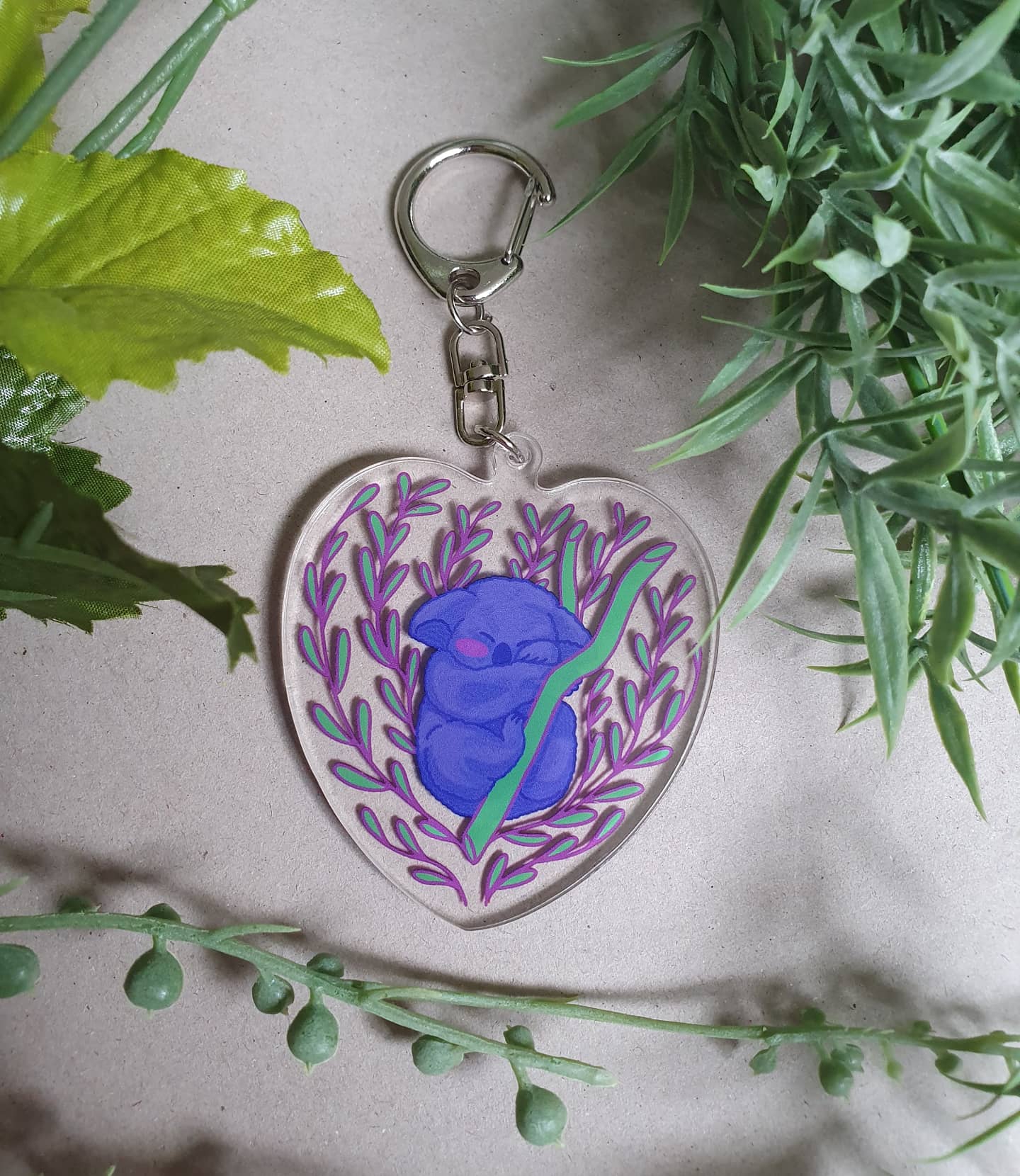A 2.5" acrylic double-sided charm of a mumma koala and her bubs! It is a heart shaped charm, with a regular silver clasp.