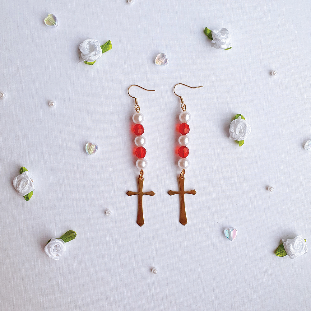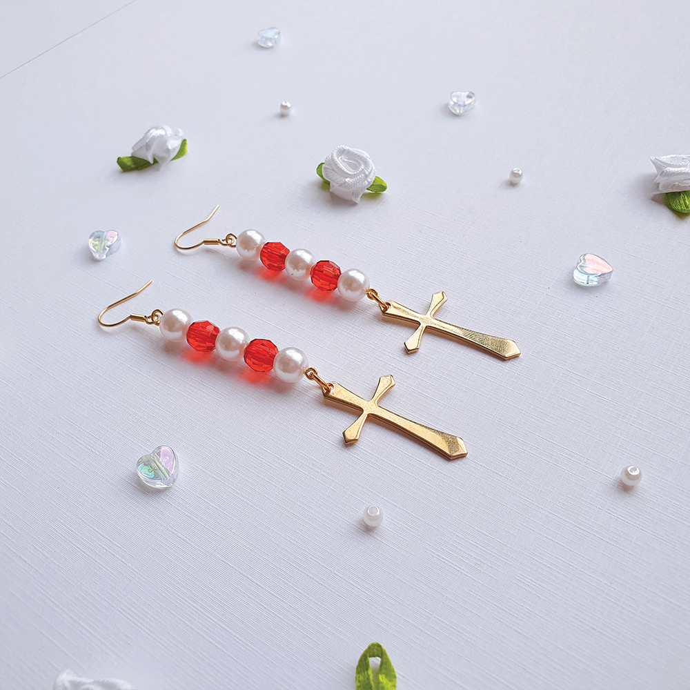 This elegant pair of romantic gothic style earrings feature an array of pearl and red jewel beads, with a stunning long golden cross charm at the bottom.