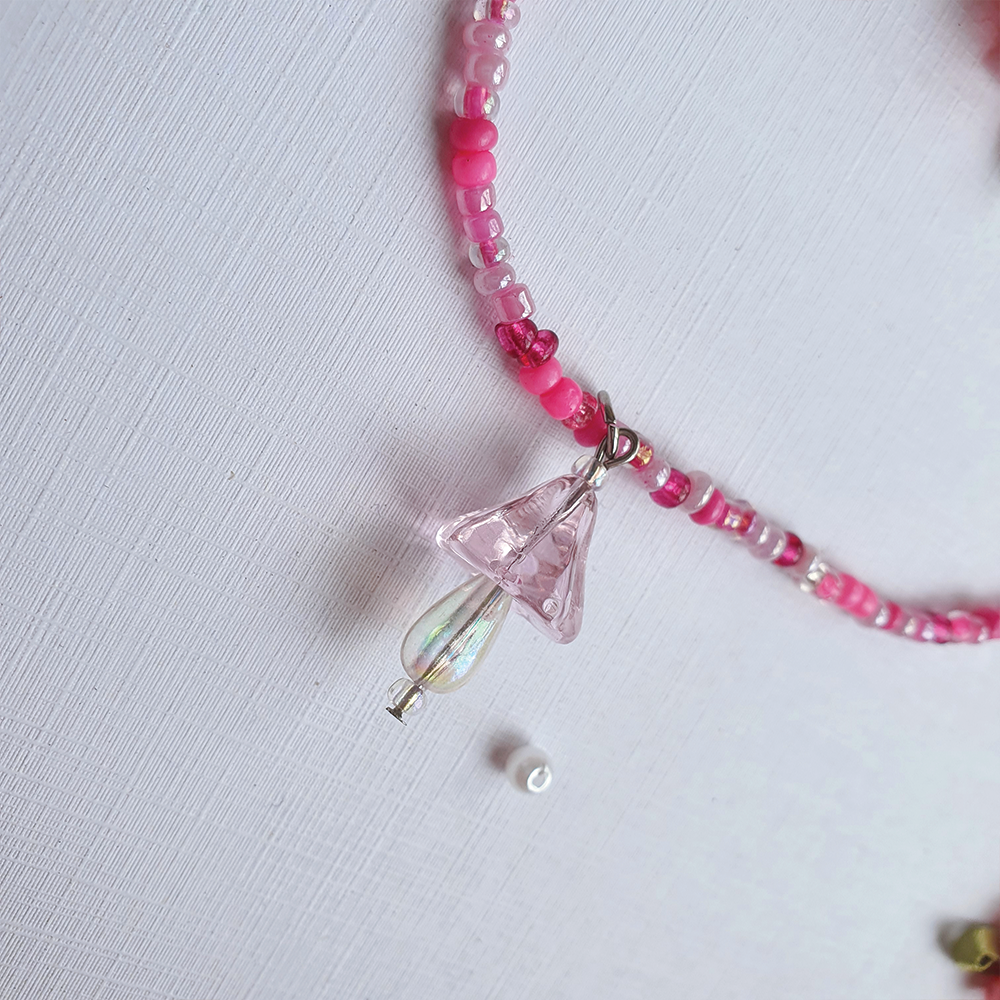 A mix of different tone pink seed beads for this choker with a cute pink glass mushroom charm!