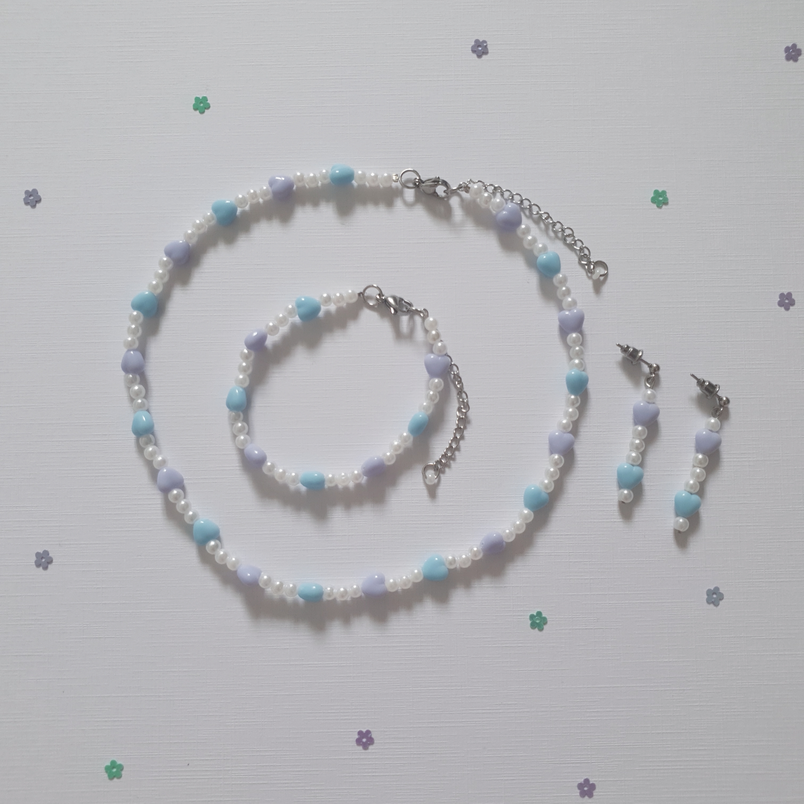 This set contains a matching pair of necklace, earrings and bracelet, that are a string of pastel blue and purple heart beads and white pearl beads!