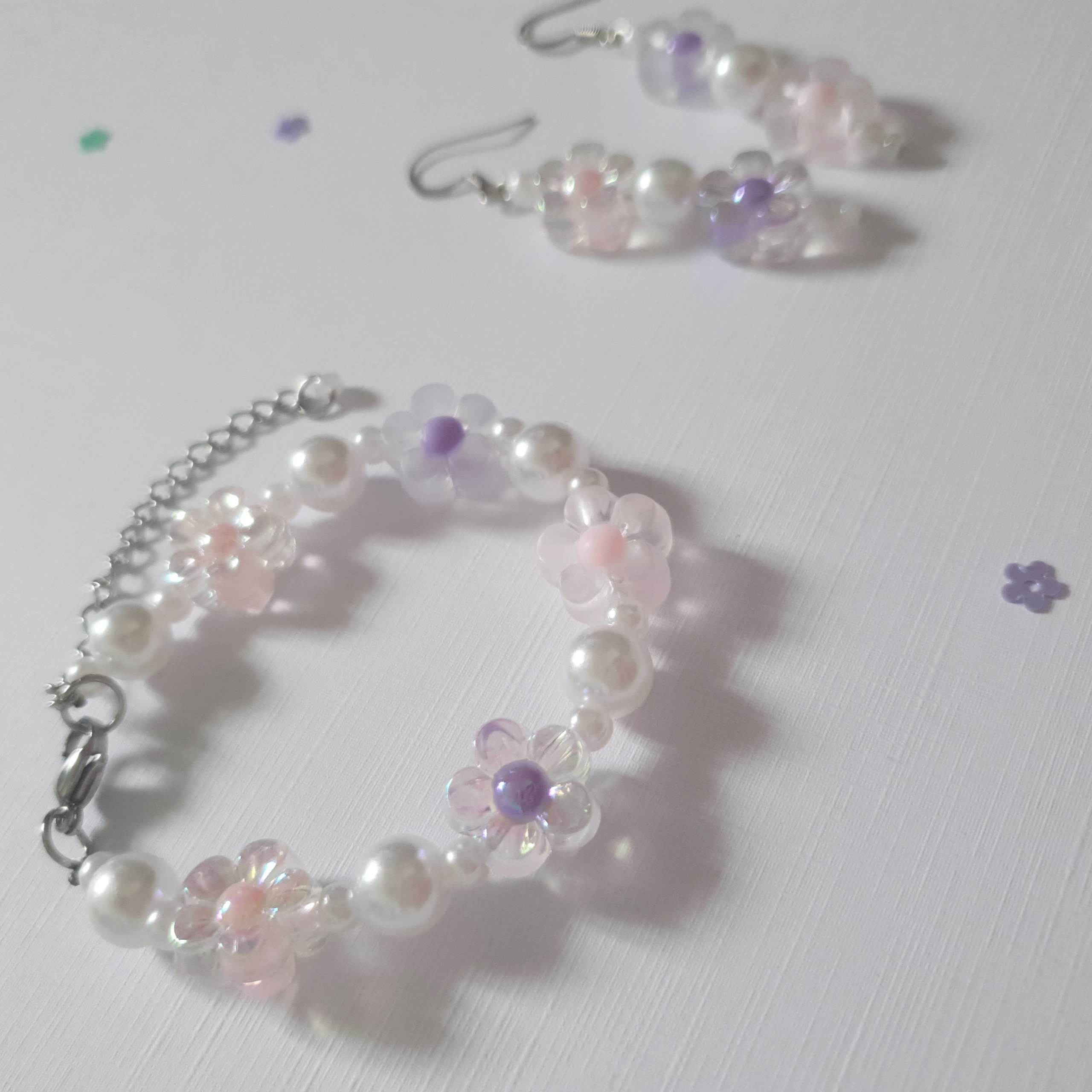 This set contains a matching set of earrings and bracelet, that are a string of pearls with a mix of purple and lilac floral beads!