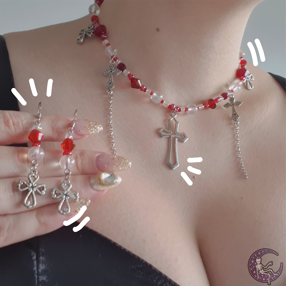 This gothic set is a must have! Made with red and clear glass beads, silver pendants and hardware, a choker with matching earrings ?