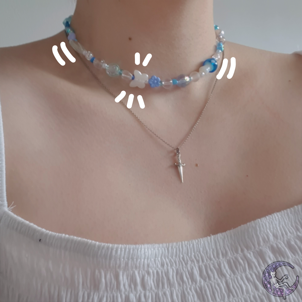 This blue and white mixed bead choker is such a great statement piece! Made with cute plastic and glass beads, glass mushroom and flower beads, with silver hardware ?
